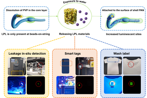 有机长余辉(LPL)材料在生物成像、防伪标识和信息加密等领域具有广泛的应用前景。然而,水的淬灭效应限制了水刺激响应型LPL材料的开发。为克服这一挑战,研究团队提出了一种创新的通用制备策略,利用同轴静电纺丝技术,通过设计核壳结构精确封装LPL材料在保护性聚合物基质中。该方法有效解决了现有材料在高湿环境下的不稳定性。当薄膜接触水时,核心层的PVP材料溶解,释放出发光材料,同时外层PAN壳层提供稳定性,确保材料在高湿度下仍保持优异性能。团队展示了该薄膜在精密仪器水泄漏检测、电子设备水入侵监测和纺织品洗涤检测等领域的应用,证明了其在智能监控和材料检测中的巨大潜力。此研究为LPL材料的商业化应用提供了新的思路,并具有广泛的市场前景。